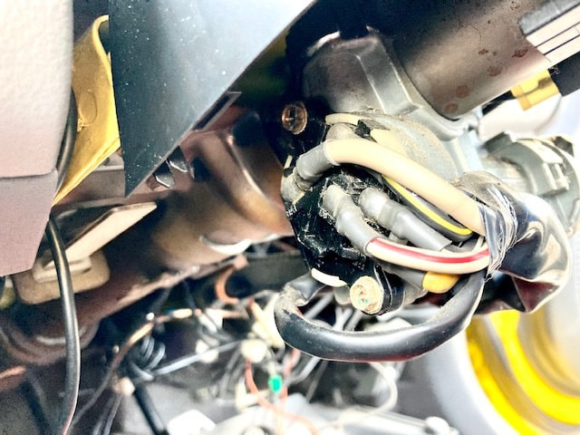 ⑨ 付属の2本の新品ビスでイグニッションスイッチ部を固定して、茶色のカプラーを差し込んで、付属の2本のタイラップでハーネスを元のように固定して下さい。