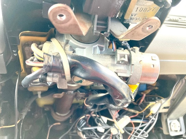 ④ キーシリンダー裏のイグニッションスイッチ部を固定しているプラス頭のビス2本を緩めて、タイラップ(乳白色)を切断して外して下さい。