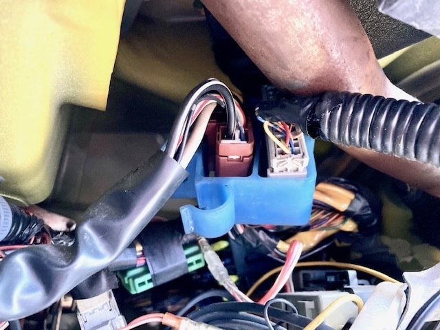 ⑤ 元のハーネスの中央辺りを上方に固定しているタイラップ(茶色)を切断し除去して下さい。元のハーネスがほぼ外れた状態になります。
